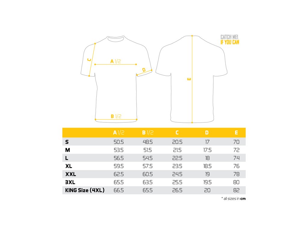 Samotné tričko je vysokej kvality, rovnako ako použitá farebná tlač. Ponúkame ich v širokej škále veľkostí od S, až po KING SIZE (ekvivalent 4+XL, ktorý je vo väčšine krajín označovaný ako XXXXXL). Model King size teda hravo oblečie aj tých najstatnejších rybárov s hmotnosťou 135kg+.