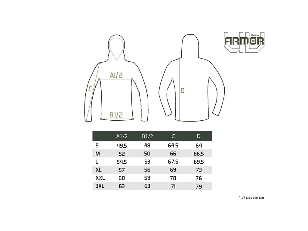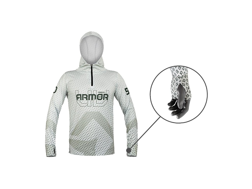 Tričko s kapucňou Delphin UV ARMOR 50+ poskytuje dôkladnú ochranu pred priamym slnečným žiarením počas letných dní. Použitá látka s ochranou UPF 50+ zabráni spáleniu citlivej pokožky a zároveň na dotyk príjemne chladí aj počas najteplejších dní.Mysleli sme aj na najprehrievanejšiu časť tela, hlavu. Tričko je vybavené výrazne vyvýšeným golierom a kapucňou, ale taktiež predĺženými rukávmi s otvormi na palec, čo zvyšuje ochranu rúk. Veľkou výhodou príjemného, elastického materiálu je schopnosť rýchleho vyschnutia v prípade v prípade namočenia počas lovu.