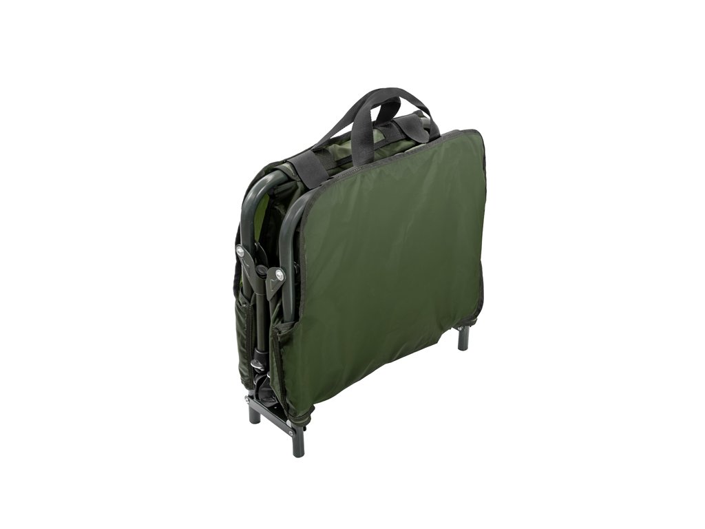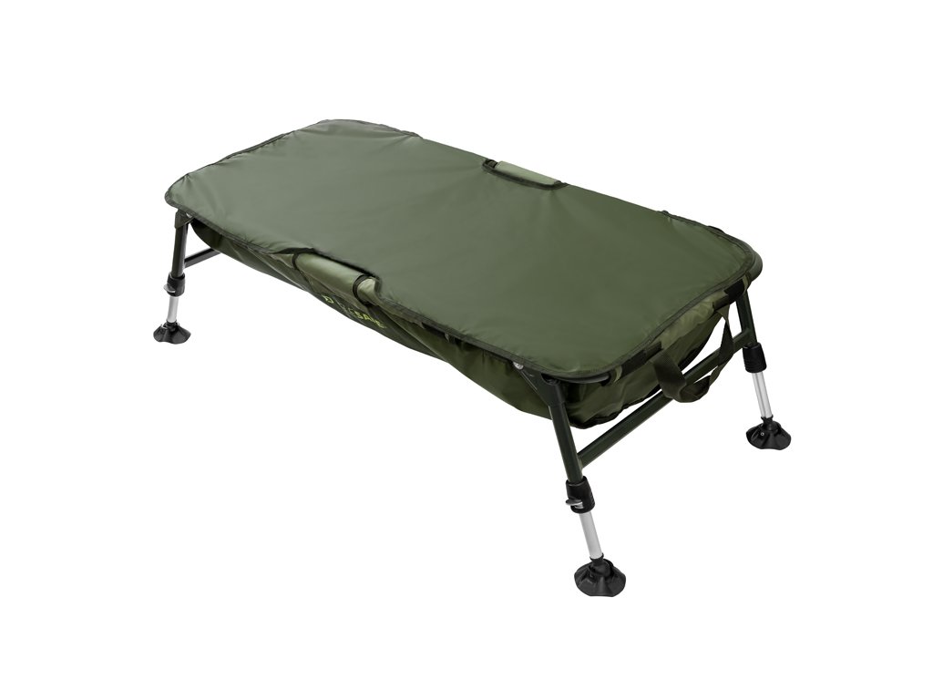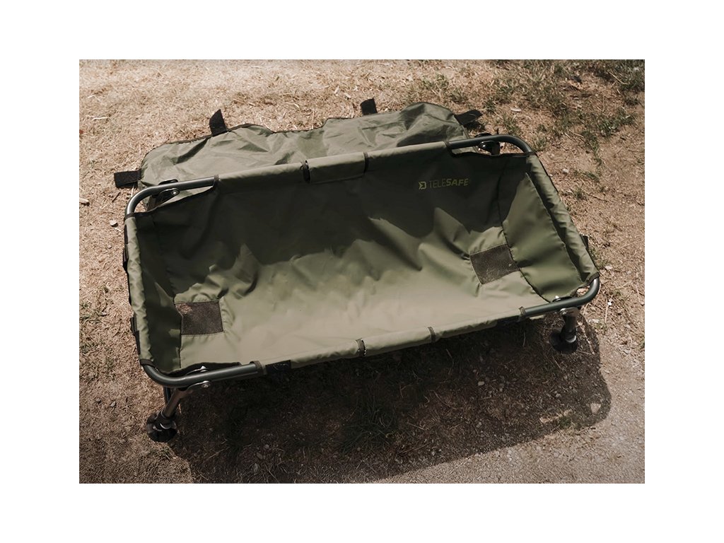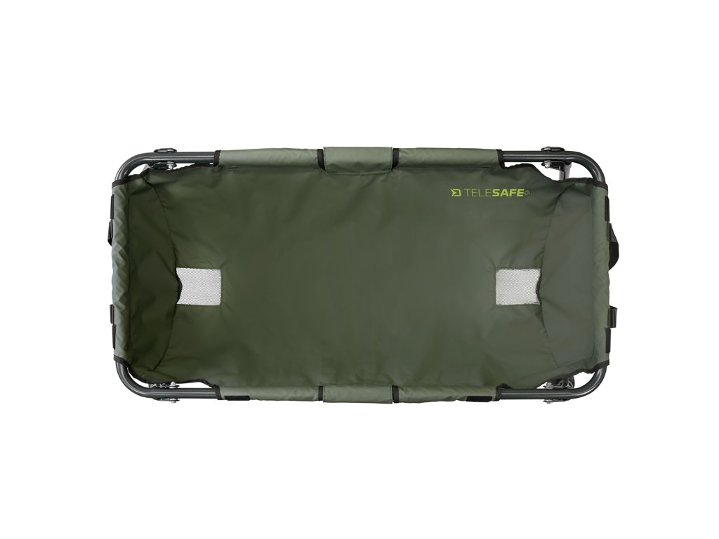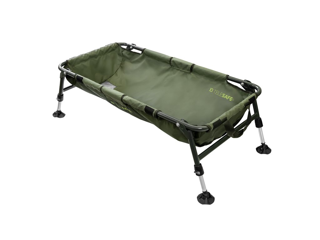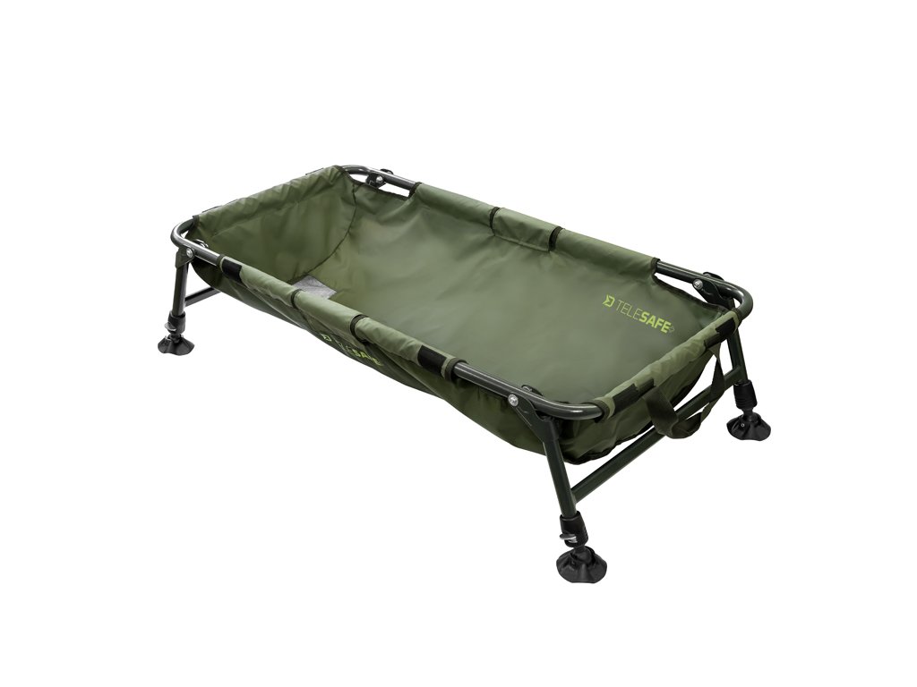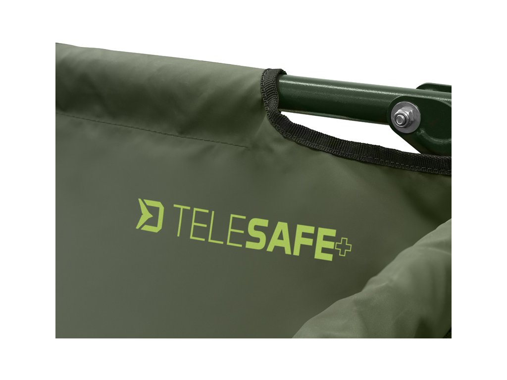 Základ vaničky TeleSAFE+ je tvorený pevnou železnou konštrukciou s priemerom rúrok až 22 mm. Použitá látka s pogumovaným povrchom má taktiež niekoľko výhod. Po ukončení lovu ju stačí do sucha vyutierať a nie je tak nutné dlho čakať kým vyschne. Navyše je veľmi ľahko umývateľná a neabsorbuje do seba nepríjemne pachy, ktoré sa môžu následne šíriť pri transporte vo vašom aute. Celá vanička je veľmi pevná a pri extrémnych testoch bez problémov zvládla udržať statické závažie o váhe až 75kg! Na oboch krajoch je všitá sieťková látka, cez ktorú z vnútra poľahky odtečie voda. TeleSAFE+ disponuje aj látkou na prekrytie, ktorá je opatrená suchými zipsami. Viete tak v nej rybu uzavrieť, pokiaľ si napríklad potrebujete pripraviť fotoaparát, prípadne ísť nabrať vodu na poliatie úlovku. Teleskopické nohy sú opatrené kĺbovými pätkami, ktoré sa prispôsobia terénu a zamedzia zaboreniu do zeme v prípade mäkšieho podkladu. Pri navrhovaní sme však mysleli aj na transport, čo je ďalšia silná stránka tohto produktu. V strede je konštrukcia dômyselne predelená a tak ju stačí jednoducho preložiť napoly a pomocou rukovätí pohodlne prenášať.