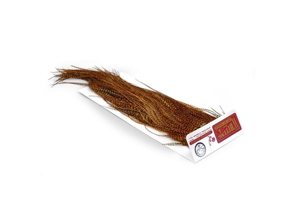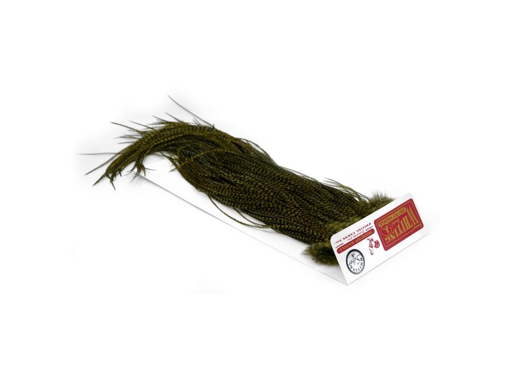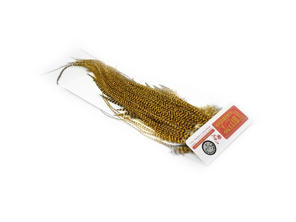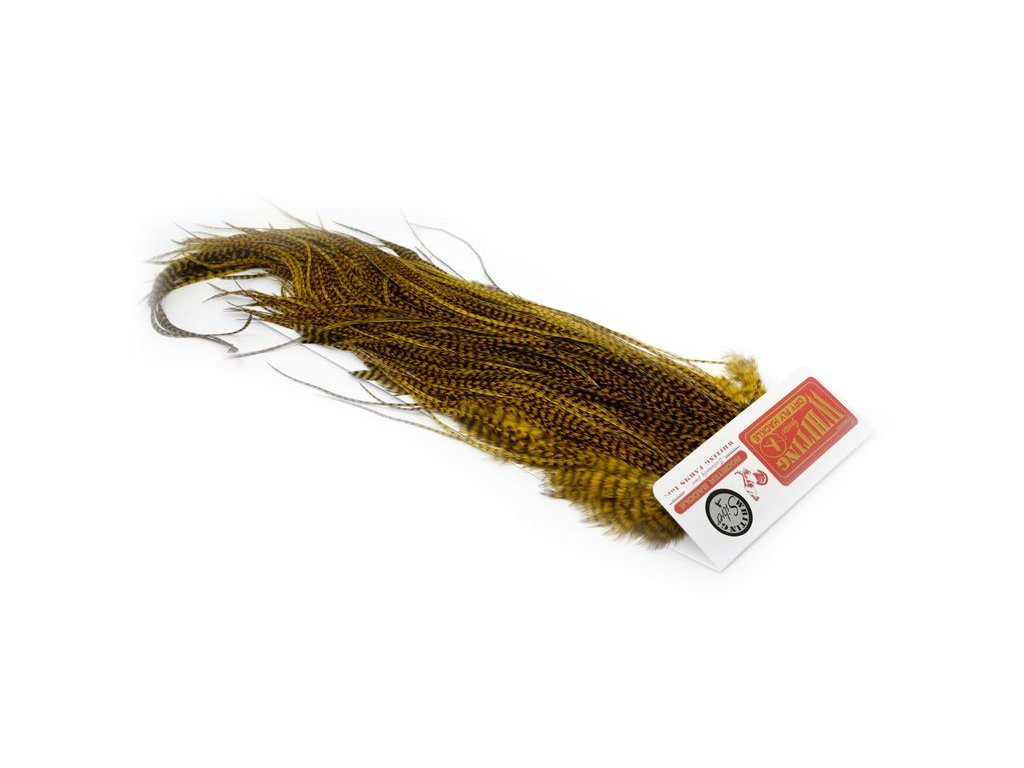 THE OLYMPIC GRADING SYSTEM Whiting's Olympic Grading System was developed to consistently grade capes and saddles across all dry fly product lines. Whiting Farms does not grade from harvest to harvest or “batch to batch”. We do not grade to push up or down pelts to meet certain sales requirements or financial obligations. We do not grade to meet consumer demand. Rather, our grading methodology remains consistent throughout the years and is independent of any bias that would skew the true value of the pelt. When grading our pelts, one rule-of-thumb always stands true: the quality level of the feather is always consistent. What does this mean? It means that each dry fly feather has a supple quill, void of twist, contains dense barbing and is greater than 85% web-free. If a pelt doesn’t meet this core criteria, the pelt is never sold in retail.