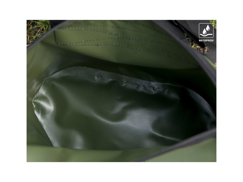 Tmavo zelený dizajn ľadvinky je doplnený decentnou čiernou grafikou s originálnym OutLINE logom kapra.